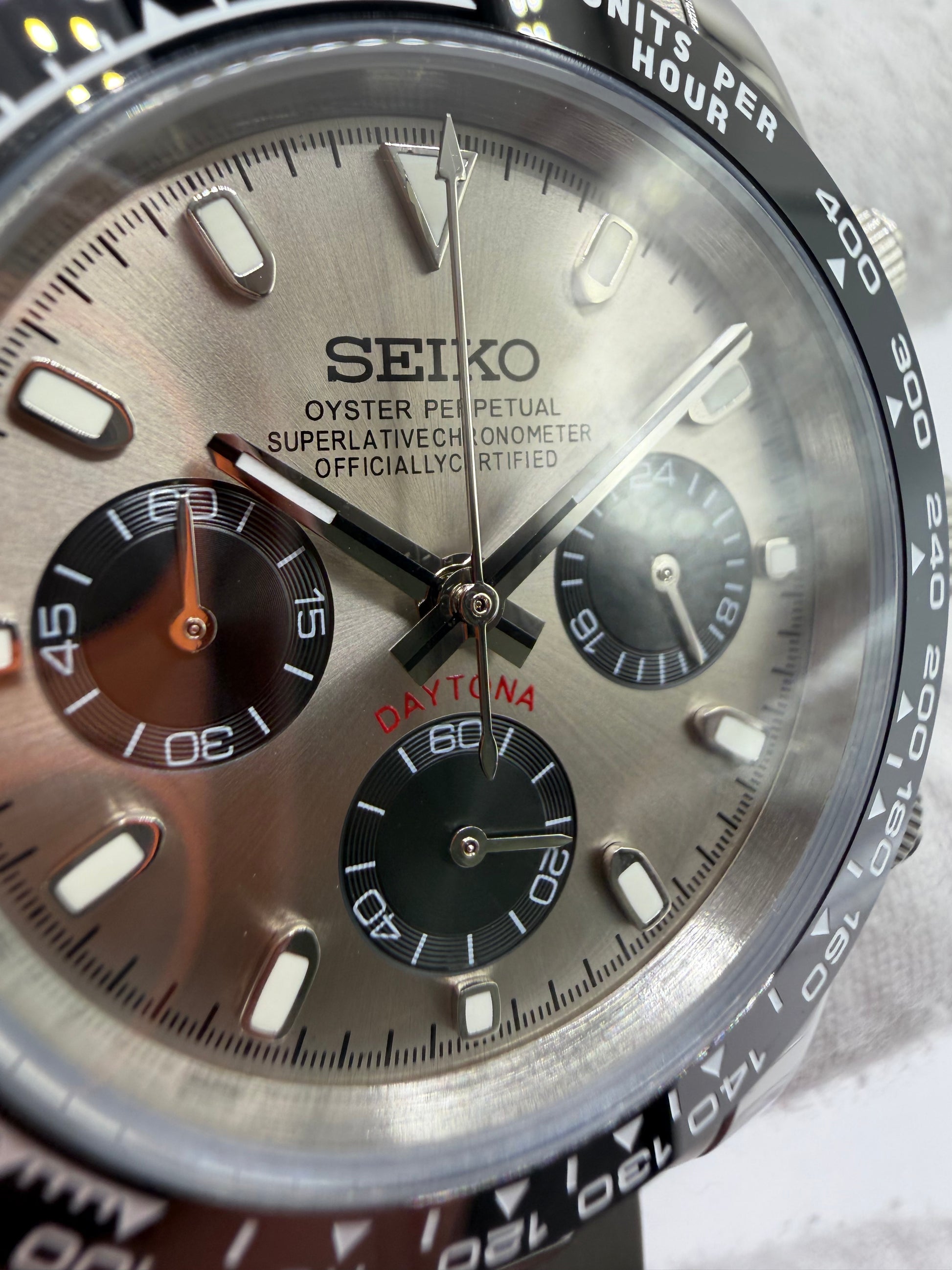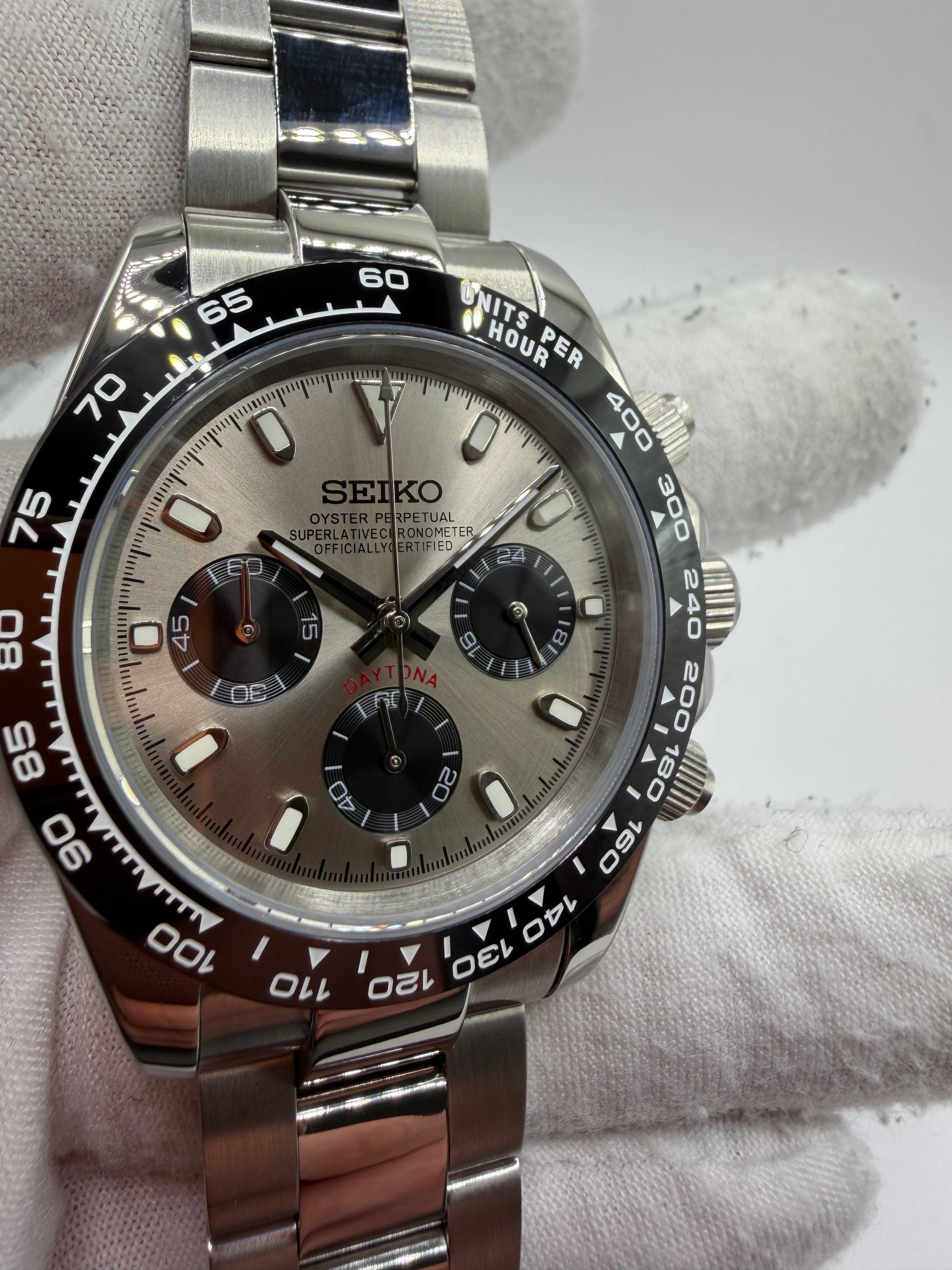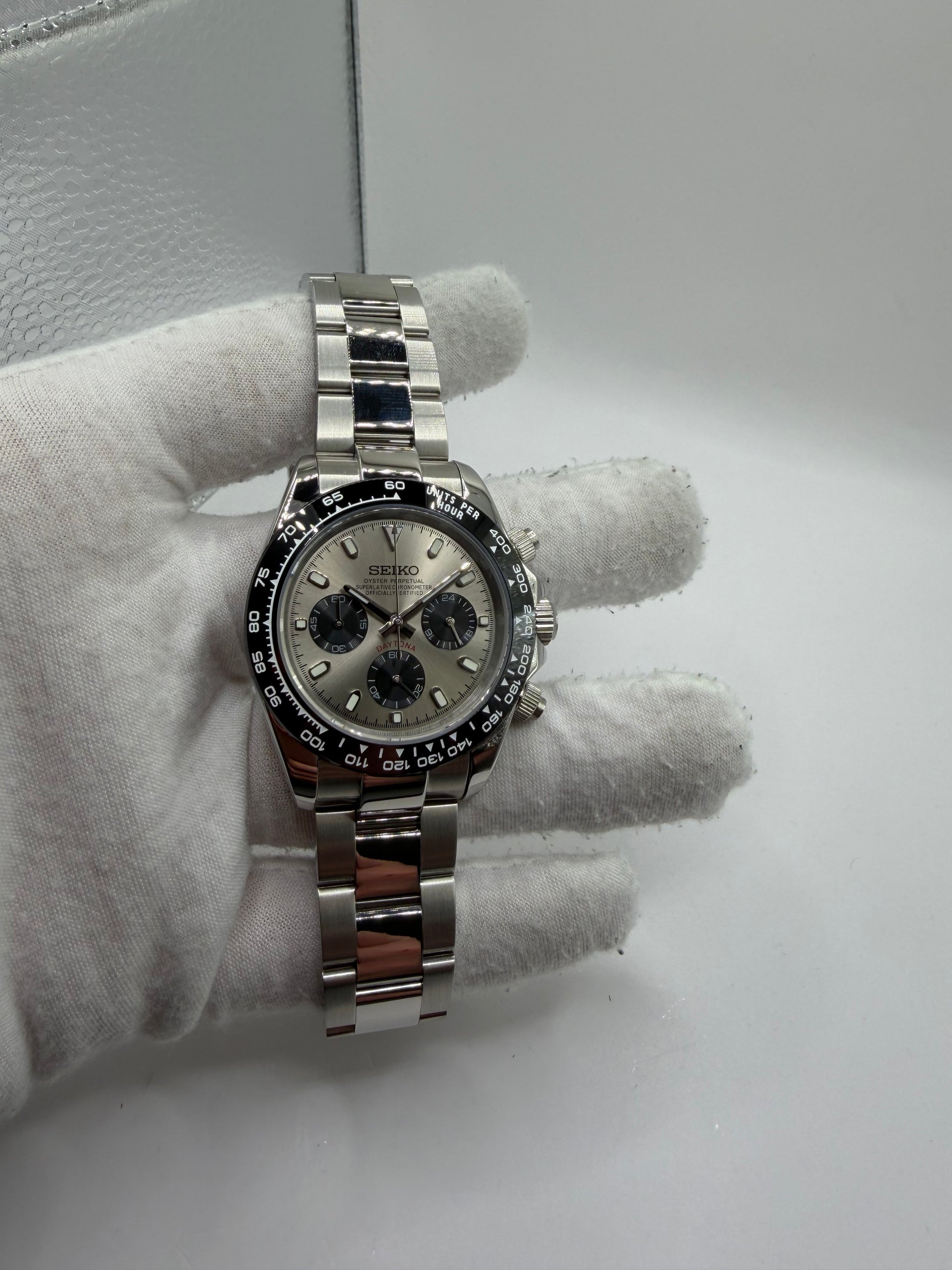 Inspirée du design iconique de la Rolex Daytona, nous avons l'honneur de vous présentez la Seiko MOD Daytona dotée du prestigieux mouvement Hybride Seiko VK63A. Une montre de 40 mm de haute qualité, alliant parfaitement excellence et accessibilité pour ne plus passer inaperçue lors de vos meilleurs évènements offrant un style unique Sport/Chic. Cette montre a été assemblée avec soin par nos experts artisans.