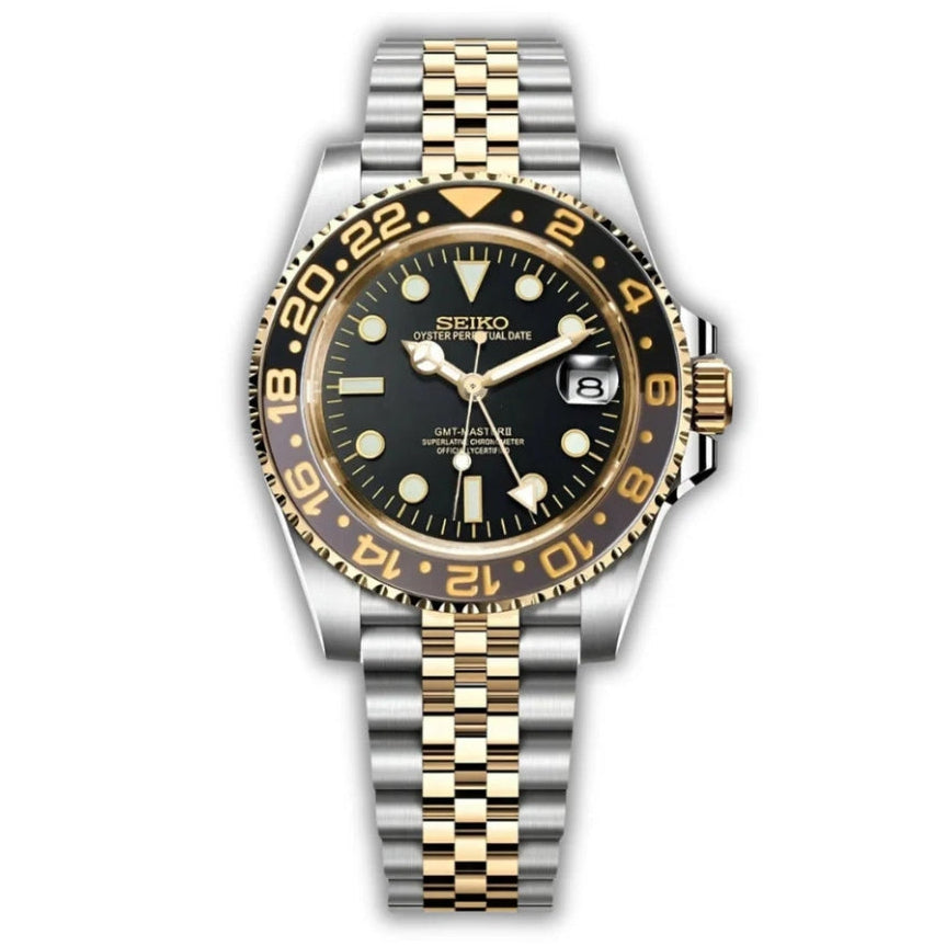 Inspirée du design iconique de la Rolex GMT Master II, nous vous présentons la MOD GMT. Dotée du prestigieux mouvement automatique Seiko NH34A, cette montre haut de gamme de 40 mm, alliant parfaitement excellence et accessibilité et tout en suivants un autre fuseau horaires a votre poignet.
