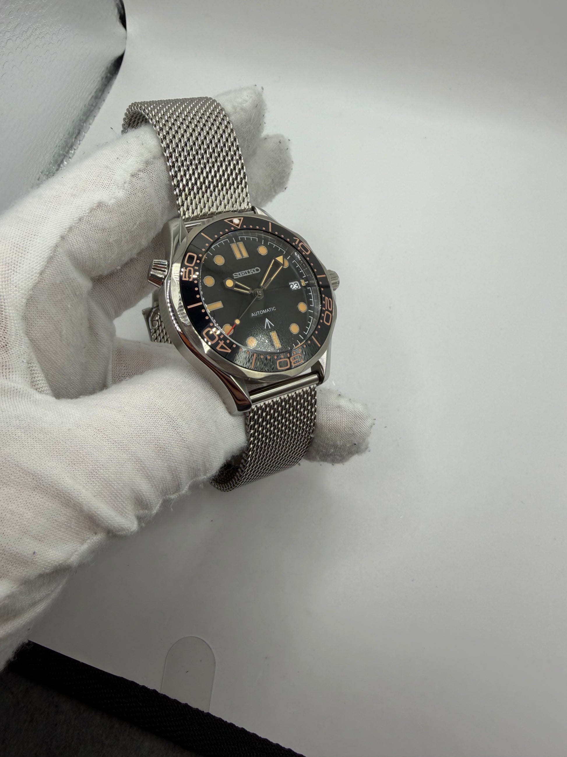Cette montre est une pièce personnalisée assemblée à partir de composants Seiko authentiques, notamment le mouvement. Il s’agit d’une modification réalisée par un tiers et elle n’est ni affiliée, ni approuvée, ni fabriquée par Seiko Watch Corporation. Le nom « Seiko » est mentionné uniquement pour décrire l’origine de certaines pièces utilisées dans cette création. Toutes les marques déposées appartiennent à leurs propriétaires respectifs.