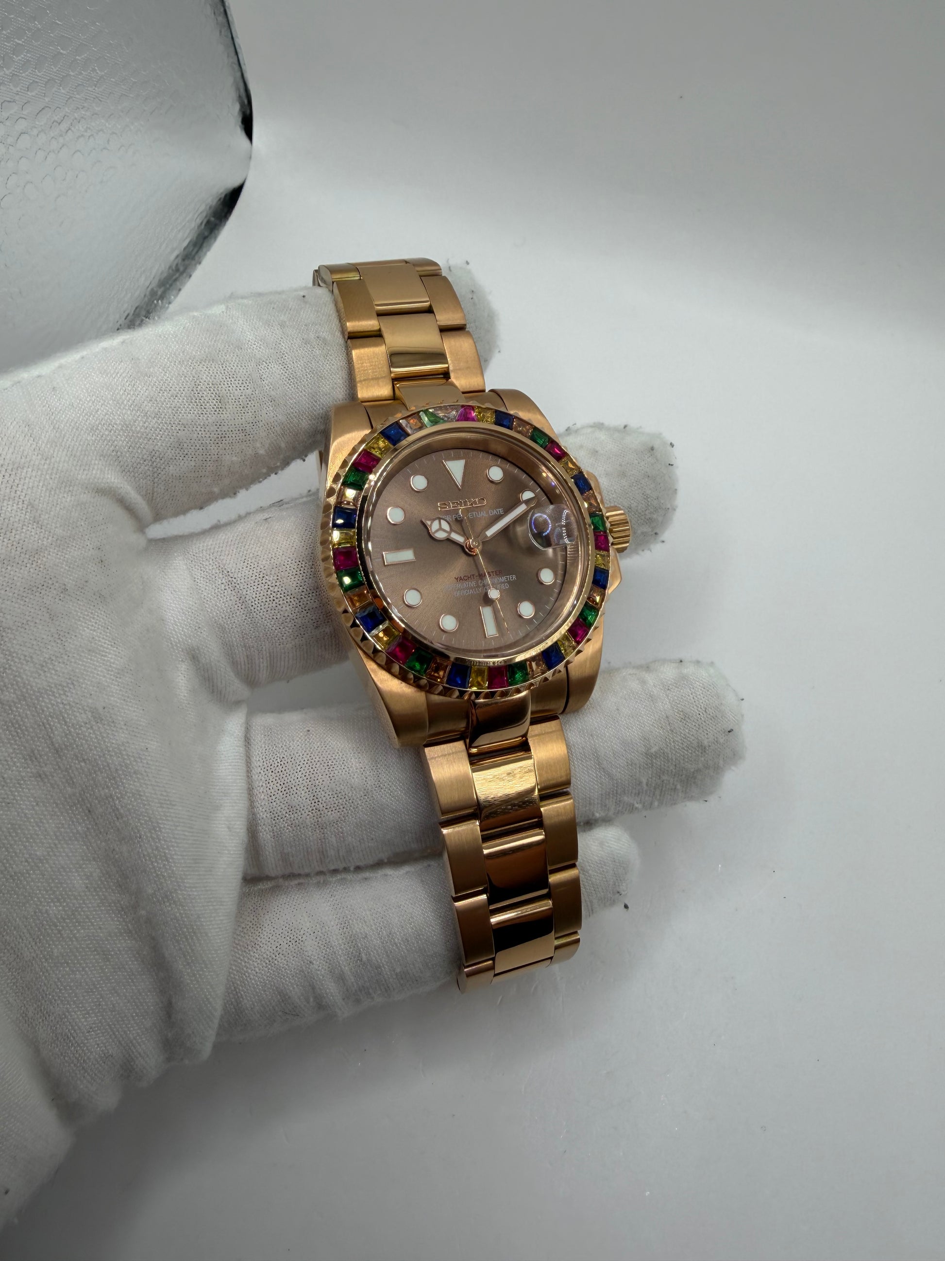 Inspirée du design iconique de la Rolex Yacht-Master, nous avons l'honneur de vous présentez la Seiko MOD Yacht-Master Rainbow dotée du prestigieux mouvement automatique Seiko NH35. Une montre de 40 mm de haute qualité, alliant parfaitement excellence et accessibilité pour ne plus passer inaperçue lors de vos meilleurs évènements avec ce style Sport/Chic. Cette montre a été assemblée avec soin par nos experts artisans.
